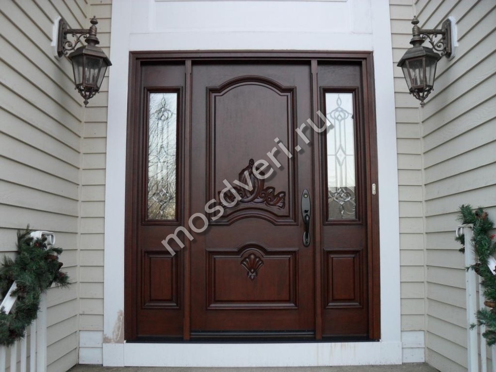 Парадная дверь в дом из массив дуба со стеклопакетом, ковкой и резьбой по дереву