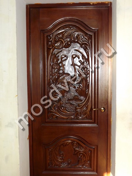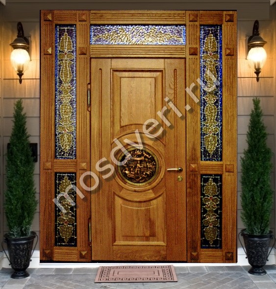 Элитная входная дверь из массива дуба со стеклом, ковной решеткой и резьбой